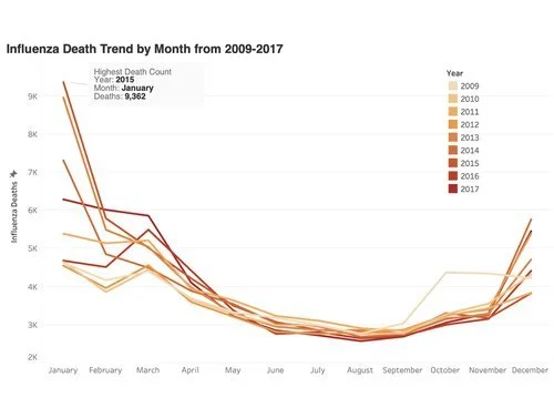This chart shows that each year has a similar trend in influenza death. The highest death count is in January, and it declines until August and starts rising again through December.