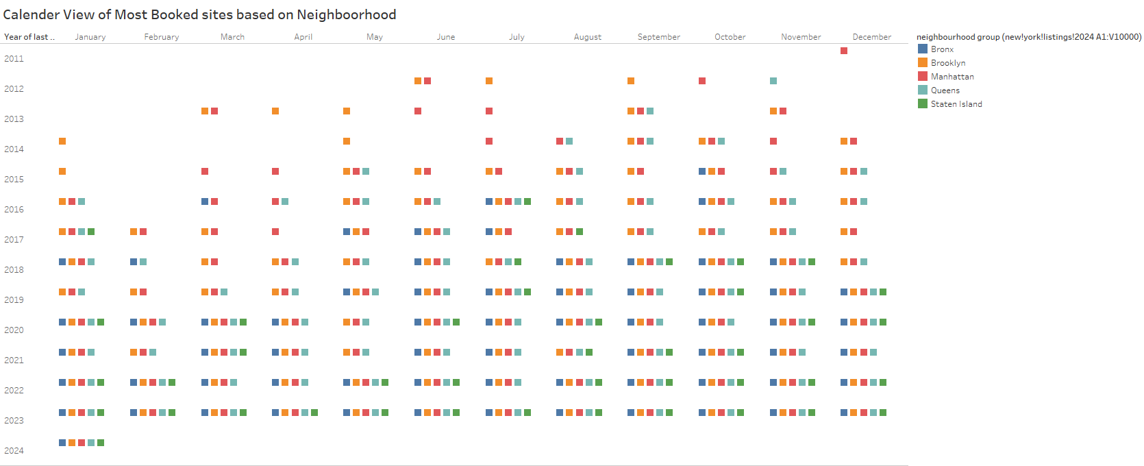 Bookings across NYC boroughs from 2021 to 2024, visually represented on a calendar: Bronx (Blue), Brooklyn (Orange), Manhattan (Red), Queens (Light Green), and Staten Island (Green).