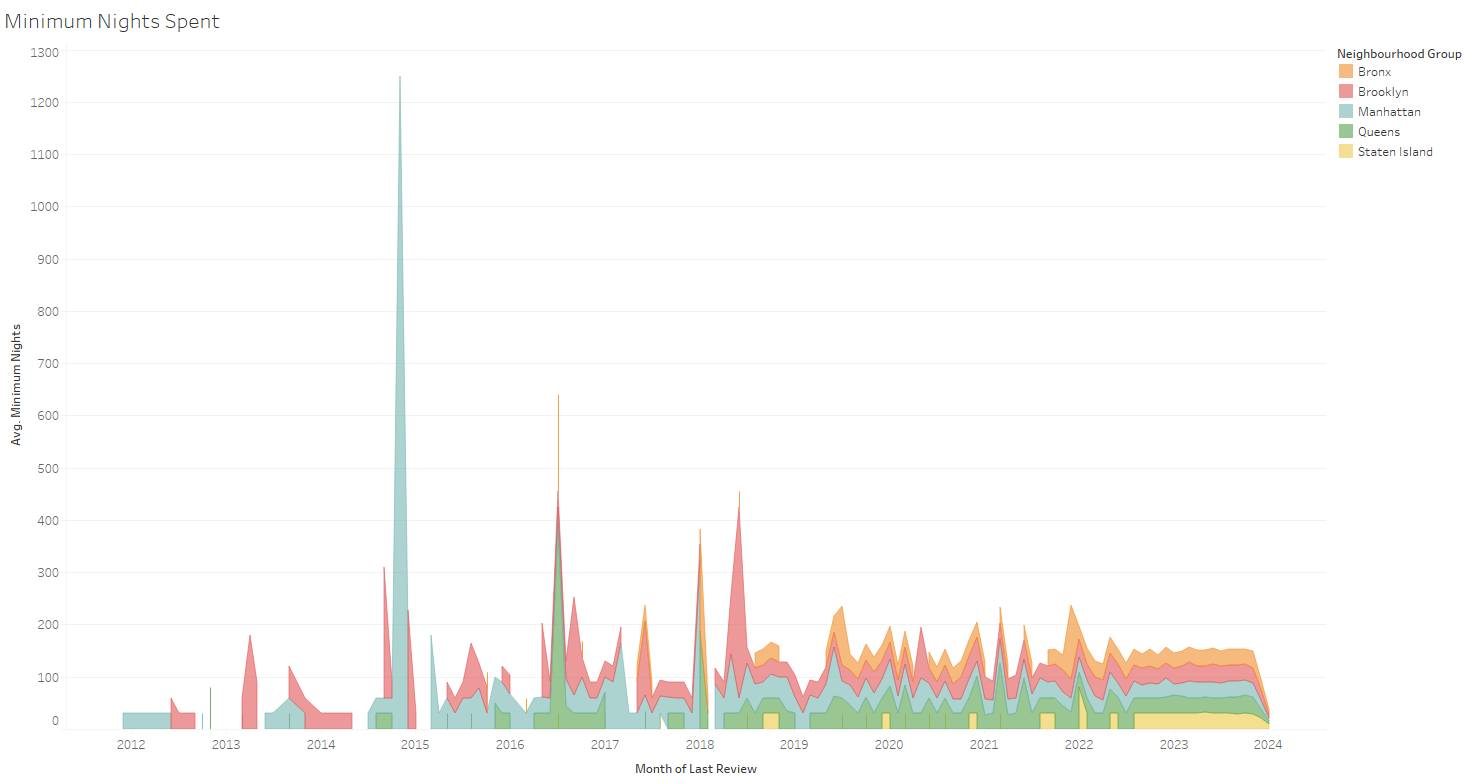 The average minimum nights spent in each of New York City's five boroughs, visualized through an area chart. The chart offers a clear comparison of accommodation preferences across neighborhoods over time, facilitating insights into tourism and urban trends.